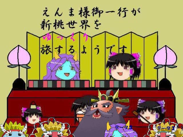 約1名いないのは仕様です。というか、最初三人官女の真ん中はデータ3あしゅらだった(で、今のデータ3あしゅらの位置がその約1名だった)けど、五人囃えんま様に隠れてほとんど見えないというネタを思いついたので急遽差し替えたため、その煽りで消えました。多分画面外でデータ3えんま様と共に左大臣右大臣やってるんじゃないかと。